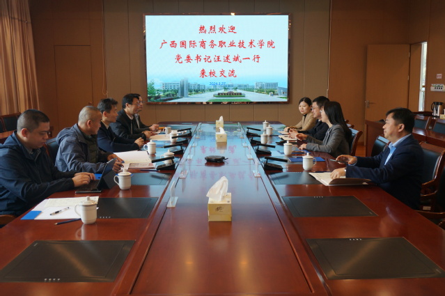 3月27日上午,广西国际商务职业技术学院党委书记汪述斌一行6人来校调研。我校党委副书记杨雪琴、党委组织部部长朱翔出席接待,发展规划处、教务处、党委办公室、校长办公室负责同志参加座谈交流。