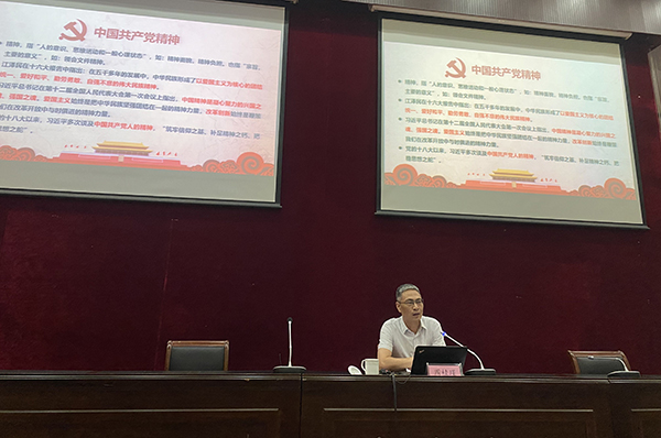 校领导们主要从“雨花英烈精神”“周恩来精神”“新四军铁军精神”进行了讲授。朱爱胜书记通过雨花英烈为国家抛头颅洒热血的悲壮人生、周恩来“为人民服务而死”的诺言、新四军刘老庄82烈士的经典案例等,深刻的阐释了雨花英烈精神、周恩来精神和新四军铁军精神。龚方红校长从全球疫情、中国战“疫”的案例引出中国特色社会主义制度的优越性和中国精神,导入中国共产党精神的江苏篇章。